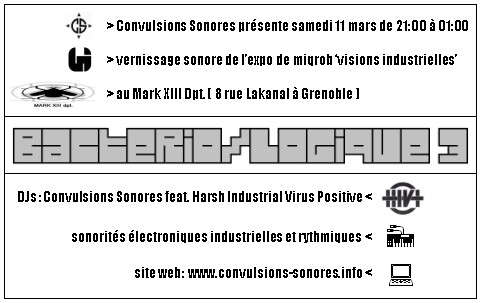 Vernissage sonore sur fond d'industriel rythmique organisé par Convulsions Sonores pour l'exposition "Visions industrielles" des graphismes géométriques de Miqrob, avec un invité de marque derrière les platines en la personne de Pedro Peñas y Robles, alias HIV+.