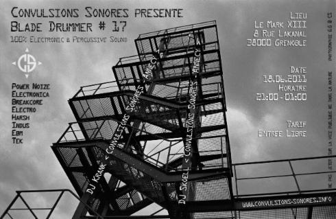 En prélude à la fête de la musique, Convulsions Sonores fera la part belle aux sonorités électroniques, et notamment à l'electro-indus et à l'electro-tek, au cours de cette dix-septième édition de la soirée soirée "BLADE DRUMMER" avec le grand retour aux platines du Mark XIII de dj Krank, résident des soirées Kod.ex à Paris, pour deux sets bien différents, l'un en warm-up lorgnant du côté d'une electro-tek ambiante quoique un minimum rythmée, idéale en chill-out, tandis qu'il finira ensuite la soirée par un set plus pêchu, à forts connotation e.b.m. et t.b.m. Un second convulsif, Skoell, viendra insérer un set mid-tempo plus electro-indus et electro-dark dans le créneau intermédiaire pour faire monter progressivement la pression.