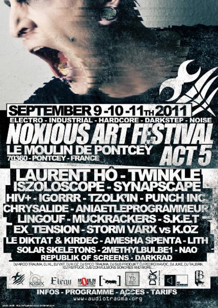 Un trio de djs convulsifs sera du cinquième "NOXIOUS ART FESTIVAL" organisé par nos amis audiotraumatisés, aux côtés d'autres djs de la scène electro-industrielle française pour un chill-out extérieur qu oscillera entre grésillements et vrombissements tandis que pléthore de groupes se partageront la scène à l'intérieur pour ce rendez-vous incontournable en France des musiques bruitistes avec en point d'orgue un concert hardcore de Laurent Hô.