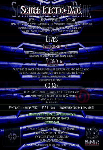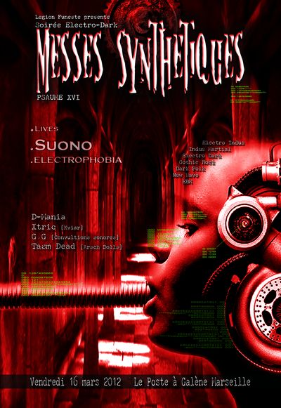 Le convulsif G.G est invité à mixer au seizième psaume des "MESSES SYNTHETIQUES", les soirées electro-dark marseillaises organisées par Légion Funeste. Les mixes seront précédés des concerts du groupe d'aggro-tech allemand SUOÑO et du groupe d'e.b.m. catalan ELECTROPHOBIA. G.G, quant à lui, apportera un peu de variété dans la programmation musicale par un set ambient en ouverture, puis des sets cold-wave/e.b.m. en milieu et fin de soirée.