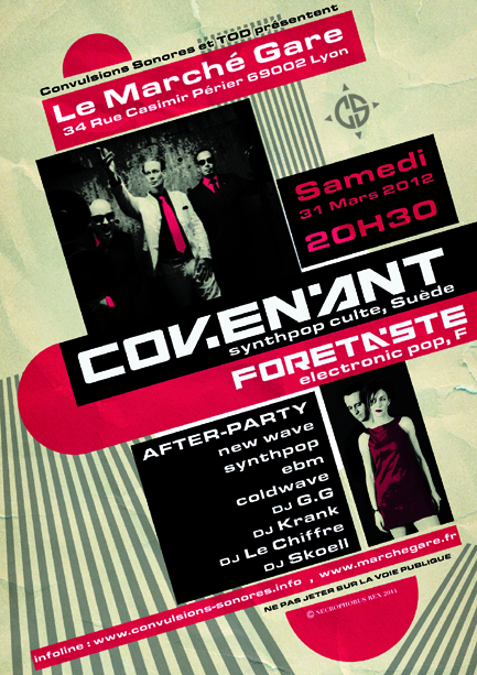 Convulsions Sonores et Tod organisent le concert de COVENANT, groupe phare de la scène electro-pop mondiale, qui se produira pour la première fois à Lyon. Le classieux chanteur suédois Eskil Simonsson, crooner électronique au look élégamment vintage à défaut d'être rétrofuturiste, est dorénavant épaulé par le talentueux Daniel Myers aux claviers, rien de moins que Monsieur Haujobb et Architect, projets marquants de la scène électro-industrielle. Covenant, c'est à la fois l'electro-indus froide de "Dreams of a cryotank", les tubes pour dancefloor de "Europa" ou encore de "United States of mind", des lives puissants comme "Synergy" ou "In transit", mais aussi de récents albums comme "Modern ruin" empreints d'une electronica subtilement mélancolique derrière le vernis pop emphatique.