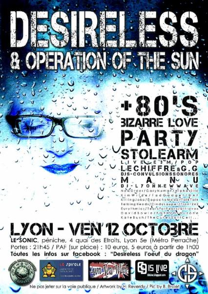 Les convulsifs G.G et Le Chiffre sont invités à mixer new-wave à l'occasion de la soirée "80's LOVE BIZARRE PARTY" à l'issue du concert de l'étonnant duo que vont constituer l'icône new-wave française DESIRELESS et le délirant projet parallèle electro-pop de Tat, OPERATION OF THE SUN. Les convulsifs partageront aussi l'affiche avec STOLEARM, groupe qui puise son inspiration autant chez Nine Inch Nails que chez David Bowie ou Gary Numan et les platines avec dj Manu, l'ancien résident des soirées Lyon New Wave mais aussi des Mystic Nights.