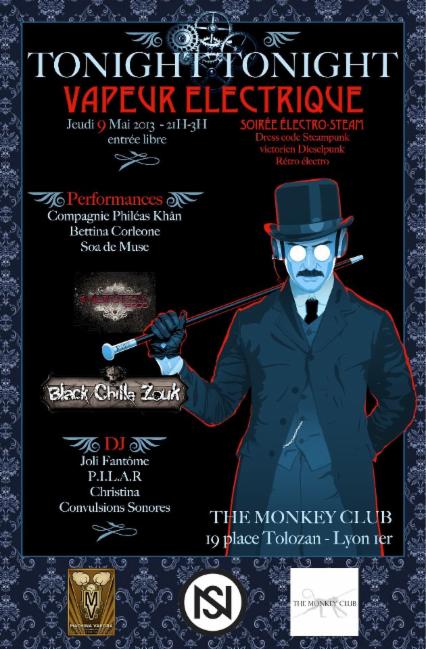 Convulsions Sonores participera aux NUITS SONORES dans le cadre victorien très cosy du Monkey Club où se déroulera la soirée steam-punk "Tonight, tonight : vapeur électrique" proposée par Machina Vapora en extra du festival. La programmation musicale axée wave est placée entre les mains de P.I.L.A.R, sélectionnée par "Les femmes s'en mêlent", qui assurera le set d'ouverture du festival aux Subsistances devant plusieurs milliers de spectateurs, mais qui est aussi connue pour mixer lors des soirées "Dark Eighties" au Sonic. Pour cette occasion, elle a invité le convulsif G.G à officier aux platines aux côtés d'autres djs, tandis que des performances burlesques viendront combler les amateurs d'ambiances burlesques.