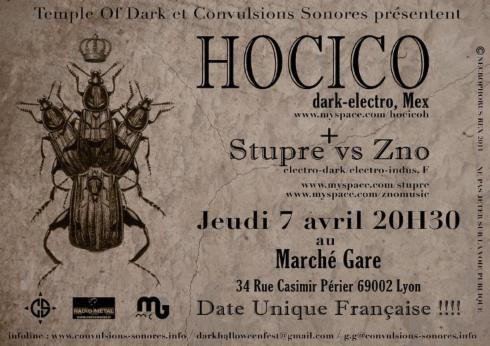 Convulsions Sonores coproduit avec Temple of Dark (ex Neutral Zone) le concert d'HOCICO, duo mexicain devenu l'un des groupes majeurs de l'electro-dark mondiale, dont l'actualité discographique est particulièrement dense avec la réédition dans un magnifique quadruple packaging des "Chroniques létales", mais surtout avec leur nouvel album "Tiempos de furia" dont la sortie en octobre 2010 justifie une nouvelle tournée européenne. A cette occasion, Erk et Rasco sont de retour sur Lyon où l'accueil qui leur est réservé par le public est toujours enthousiaste. Ils vont encore une fois délivrer un show à l'energie particulièrement enfiévrée et malsaine mélangeant sonorités électroniques torturées et voix agressive.