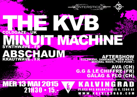 A l'occasion d'une soirée dédiée à l'action tout au long des années 2000 de l'association franco-suisse Interstice, Kalvingrad qui partage avec Post Tenebras Rock le rez de l'Usine, emblématique salle de concert alternative genevoise dont la réputation n'est plus à faire, invite Convulsions Sonores à mixer en after du concert de The KVB qui sera précédé, sur les conseils de G.G, de Minuit Machine et d'Abschaum en premières parties.