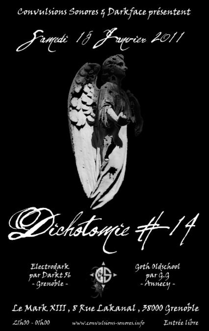 Suite au forfait de dernière minute du convulsif G.G lors de la dernière virée programmée sur Grenoble, Convulsions Sonores et Darkface remettent le couvert pour une quatorzième DICHOTOMIE où le duo sera bien au complet, le grenoblois Darkt 56 pour l'electro-dark, l'annécien G.G pour les vieilleries cold-wave, gothique et batcaves, le tout par sets d'une demi-heure. De quoi bien démarrer l'année 2011...