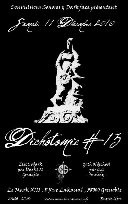 Convulsions Sonores organise, en partenariat avec l'association grenobloise Darface, une soirée DICHOTOMIE, la treizième du nom! Au programme, toujours un harmonieux contraste entre sonorités electro-dark et gothique.