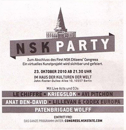 Convulsions Sonores sera du premier CONGRES DU N.S.K. qui se tiendra à Berlin cet automne. En effet, le convulsif Le Chiffre a été sélectionné pour représenter les citoyens de cet état virtuel au sein d'une délégation de trente membres issus du Monde entier. Il y sera le seul participant invité de France. Le Neue Slowenische Kunst, micronation fondée en 1992, se veut une manifestation d'art total : il s'agit de la création d'un état virtuel avec des ambassades ponctuelles délivrant des pièces officielles telles passeports et timbres, dont le but est de mettre en exergue pour mieux les dénoncer, comme à travers toute l'oeuvre du groupe de musique industrielle Laïbach, qui en est l'un de ses plus éminents fondateurs et compositeur de l'hymne officiel figurant sur l'album "Volk", toutes les absurdités et dérives liées aux systèmes politiques, en parodiant notamment les plus autocratiques et dictatoriaux d'entre eux. Les débats seront animés par d'éminents politologues, sociologues, économistes, philosophes, et le congrès s'achèvera par une soirée publique avec exposition de l'art officiel du N.S.K. ainsi que des concerts et des mixes dont celui du Chiffre ! Cette manifestation a reçu le soutien de partenaires institutionnels prestigieux tels le Ministère de la Culture Slovène, la Ville de Berlin et l'Union Européenne.