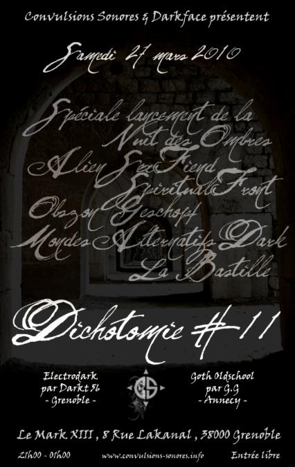 Onzième édition de la soirée DICHOTOMIE co-organisée par Convulsions Sonores et Darkface, qui alternera electrodark et gothique vieille école par tranches d'une demi-heure, avec une sélection de titres des artistes amenés à se produire fin mai lors de la Nuit des Ombres dont cette Dichotomie consituera le lancement en partenariat avec les Mondes Alternatifs Dark qui l'organisent.