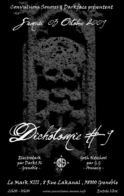 Convulsions Sonores et Darkface organisent la neuvième DICHOTOMIE pour un versus entre electro-dark et gothique par tranche d'une demi-heure, avec toujours les résidents Darkt 56 et G.G fidèles au platines.