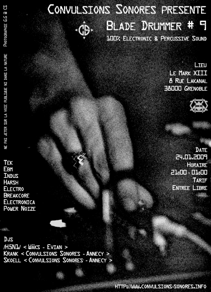 Convulsions Sonores organise la neuvième édition de sa soirée électro-industrielle rythmique BLADE DRUMMER au Mark XIII. Pour cette édition, les convulsifs seront rejoints par /H5N1/, l'homme aux machines des Wäks, qui retrouvera ainsi le lieu où il fut résident il y a plusieurs années.