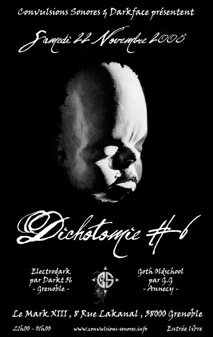 Convulsions Sonores organise, toujours en collaboration avec l'association grenobloise Darkface, la sixième soirée DICHOTOMIE, un versus entre electro-dark et gothique vieille école (cold-wave, batcave, death-rock, gothic-rock), le tout servi par tranches d'une demi-heure.