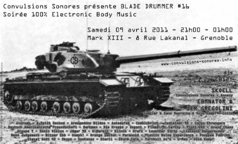 Les convulsifs et Mark XIII sont heureux d'accueillir les forces lilloises de l'émission radiophonique Sampler & Sans Reproche à l'occasion des 20 ans de diffusion sur les ondes pour une BLADE DRUMMER #16 qui sera donc exclusivement consacrée à l'E.B.M. puisque ce sont des passionnés du genre qui officient également au sein du groupe Void Kampf. La délégation nordiste sera concurrencée par le local CB12! d'Electronic Commando et bien entendu un représentant convulsif en la personne de Skoell, notre spécialiste du genre. Bretelles de rigueur pour tout amateur de Front 242, Deutsch Amerikanische Freundschaft, Nitzer Ebb qui se respecte, le pompodrome sera bien rempli...
